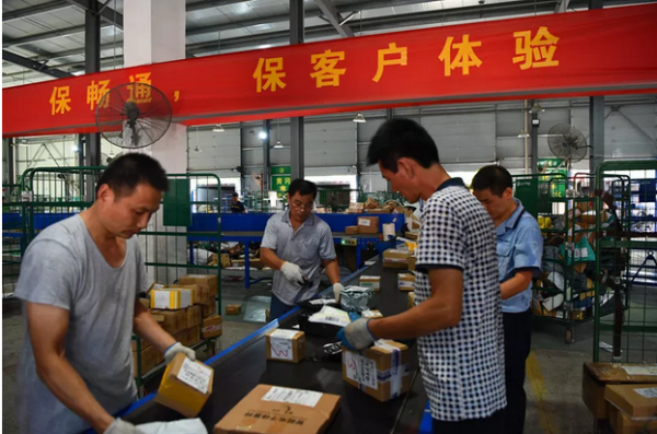 鋼結構的處理中心在烈日的炙烤下像一座巨大的烤箱,十幾個大功率電扇吹出的是一陣陣熱浪,配合著皮帶傳輸機的轟鳴,讓人多待一會都會覺得難受。為了保證時限,大大小小的包裹都得快速分揀,分揀員們的衣服以肉眼可見的速度被汗水浸透,工作強度非常大。“每天算上加班車,我們要處理13輛郵車的郵件,有時候量多一點會忙到晚上十點后。”轉運中心負責人程波告訴我們。