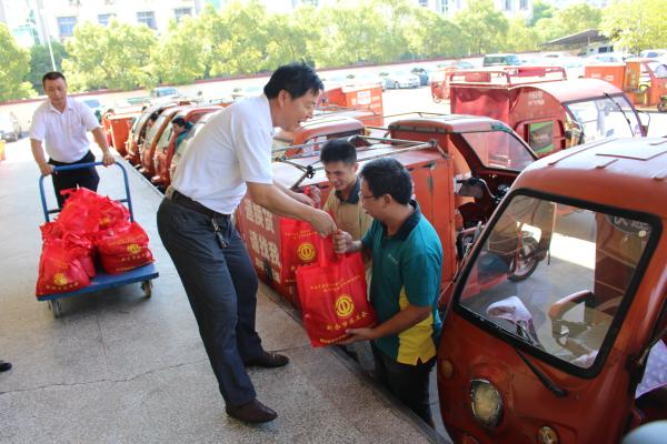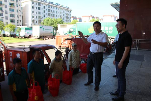 7月18日上午,新余市總工會(huì)常務(wù)副主席賴新云一行來到市郵政公司,在市分公司副總經(jīng)理秦立明的陪同下,走訪慰問了那些在高溫酷暑天氣下穿梭于大街小巷的投遞員們,為他們送去了綠豆、冰糖、花露水、人丹、風(fēng)油精等防暑降溫物品,叮囑他們要加強(qiáng)安全生產(chǎn),切實(shí)做好防暑降溫工作。