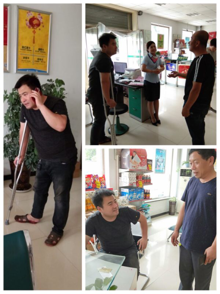 自今年5月份起縣分公司開展4個保險競賽以來,許久靜同志一直放棄周六日休息時間,帶領同事們一起宣傳走訪,邀約客戶,還要對網(wǎng)點每天的出單情況進行督導,非常辛苦。在他和同事們的不懈努力下,作為一個中等規(guī)模的網(wǎng)點,婁杖子支局發(fā)展期繳保費累計150余萬元。在7月2號的網(wǎng)點保險爆點活動前,他由于搬運大件郵件,不小心從樓梯旁摔倒將腳崴傷,目前走路都成問題,但絲毫沒有影響他完成任務的信心。7月2號網(wǎng)點爆點活動開始,他拄著拐杖出現(xiàn)在工作崗位,對網(wǎng)點爆點活動開展情況繼續(xù)進行督導,對自己維護的意向客戶進行邀約,為辦理業(yè)務的客戶答疑解惑,時刻關注爆點活動的出單量.....。繁忙的工作讓他的腳又脹又痛,但他強忍疼痛,依舊堅守崗位,同事們看在眼里,既心疼但又感到由衷地敬佩,得到了全體員工的一致贊揚。