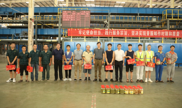7月26日上午,張國(guó)壽一行又來(lái)到了南昌郵區(qū)中心局開(kāi)展“送清涼”慰問(wèn)活動(dòng),為奮戰(zhàn)在高溫一線的郵件處理中心員工送上了涼茶、冰糖、綠豆等防暑降溫食品,并囑咐員工一定要注意防暑降溫,保重身體,尤其是外勤駕駛員一定要注意勞逸結(jié)合,合理安排作息時(shí)間,保質(zhì)保量完成各項(xiàng)生產(chǎn)任務(wù)。