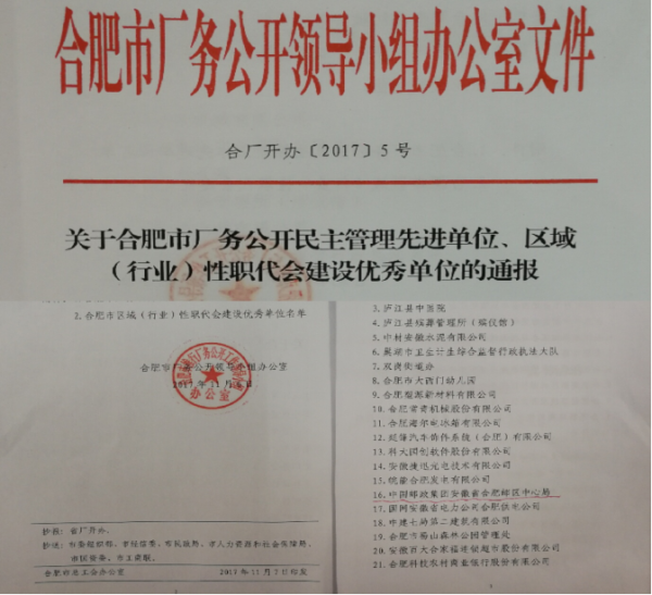 近日,從合肥市總工會(huì)獲悉,合肥郵區(qū)中心局榮獲2017年度合肥市廠務(wù)公開民主管理先進(jìn)單位稱號(hào)。多年來,在上級(jí)工會(huì)重視關(guān)心下,我局堅(jiān)持以服務(wù)大局、服務(wù)改革、服務(wù)基層為工會(huì)工作中心,不斷推進(jìn)我局廠務(wù)公開民主管理制度化、規(guī)范化、法制化、標(biāo)準(zhǔn)化建設(shè),激發(fā)廣大職工的主人翁精神,維護(hù)和保障廣大職工的民主政治權(quán)利,建立和諧的勞動(dòng)關(guān)系。