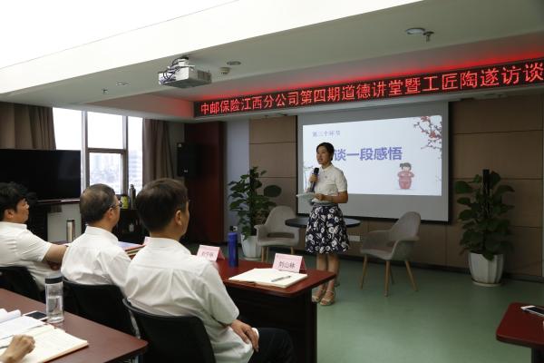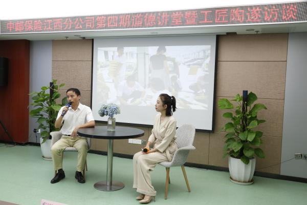 9月20日上午,中郵保險江西分公司舉辦了第四期“道德講堂”暨工匠陶遂訪談活動?;顒庸苍O(shè)有五個環(huán)節(jié):“唱一首歌曲,講一個故事,談一段感悟,作一個承諾,送一份吉祥”。