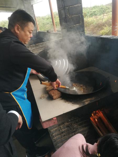 在參觀完羅坊會議紀(jì)念館后,全體人員帶著網(wǎng)點(diǎn)自購食材乘車來到八0農(nóng)莊開展秋游活動。區(qū)分公司首先將15個金融網(wǎng)點(diǎn)抽簽分為4個小組,然后將現(xiàn)場租賃的4個灶臺分配給各小組使用。每個小組在小組長的帶領(lǐng)下,根據(jù)組員特長進(jìn)行分工協(xié)作,各司其職,洗菜、切菜、生火、掌勺、打掃戰(zhàn)場等現(xiàn)場井然有序。不一會兒,紅燒鳊魚、小炒牛肉、開心花甲等菜肴都擺在大家面前,無論形狀、還是色澤,無不讓人饞涎欲滴,有的小組成員迫不及待的想嘗個鮮。大家都沉浸在勞動的快樂和美味中,場面熱鬧、和諧、溫馨。