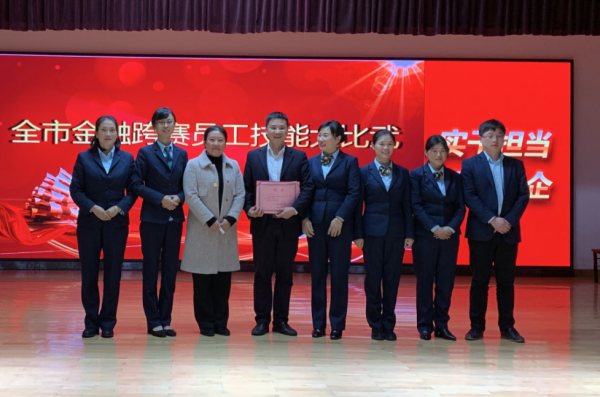 撫州市分公司金融業(yè)務(wù)部卜燕云經(jīng)理為榮獲一等獎的資溪縣分公司頒獎并合影留念。