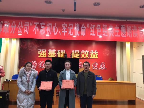 為深入推進(jìn)黨的十九大精神的學(xué)習(xí)貫徹,12月10日晚,靖安縣郵政工會開展了“不忘初心、牢記使命”紅色經(jīng)典主題朗讀競賽活動。來自柜員、營業(yè)員、會計,財富中心經(jīng)理等不同崗位的10位參賽選手,用朗誦的形式歌頌黨的十九大、歌頌革命烈士、歌頌企業(yè)的勞模先進(jìn)事跡??h分公司總經(jīng)理鄒運芳、副總經(jīng)理吳慧敏、工會組織委員左紫霞、渠道平臺中心經(jīng)理陳開銀、市場營銷部副經(jīng)理黃亞婷擔(dān)任評委,工會干事賈穎濤擔(dān)任主持人。