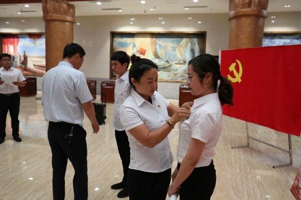 圖為老黨員為新黨員佩戴黨徽