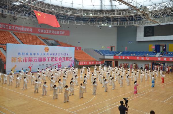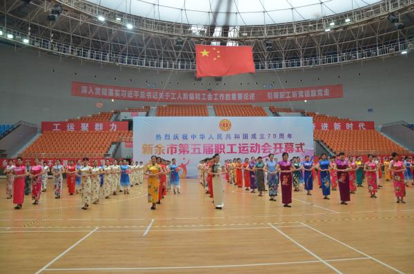 當天上午,新余市總工會領導首先致開幕辭。在《舞進新時代》的音樂聲響起時,場上40多個代表隊聞歌起舞,運動會正式開幕。隨后,太極、旗袍秀等表演陸續(xù)上臺。最后,開始了廣播體操比賽。