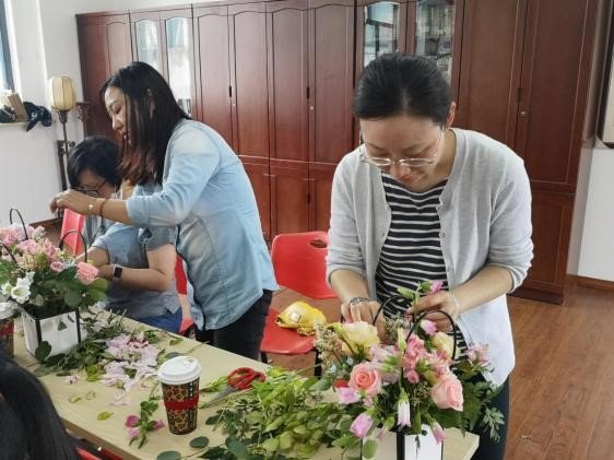 插花是一門技術(shù),一枝一束,一插一剪,都會塑造不同的形態(tài),傳遞不同的情感?;顒蝇F(xiàn)場,花藝?yán)蠋熢敿?xì)介紹了插花藝術(shù)的基本知識、常見花種、插花的基本花型及技巧等內(nèi)容,給大家普及了理論知識。大家表現(xiàn)出了濃厚的興趣,都禁不住拿起花材躍躍欲試。