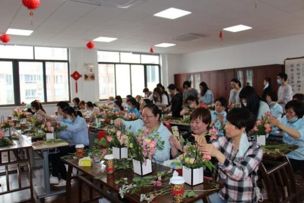 跟隨著花藝?yán)蠋煹氖痉吨v解,大家邊看邊學(xué),先從每枝花材的去葉、摘腐處理開始,慢慢修枝剪葉,整理樣式,并逐步按照老師傳授的色彩過渡、高低錯落、疏密有致的插花要領(lǐng)構(gòu)思插花位置,進(jìn)行造型搭配。大家個個精工細(xì)作,嚴(yán)謹(jǐn)認(rèn)真,用自己的創(chuàng)意與女性獨(dú)有的細(xì)膩情感,賦予花材全新的生命力。端莊的芍藥、嬌艷的玫瑰、靈動的風(fēng)鈴、淡雅的桔?!@些原本簡單的鮮花很快就在一雙雙巧手中綻放出別樣美麗,變成了一件件生機(jī)盎然、形態(tài)多姿的花藝作品。看著各自的勞動成果,大家笑靨燦爛,臉上洋溢著滿滿的成就感、喜悅感和幸福感。嬌艷的花朵輝映著女職工們燦爛的芳容,撲鼻的花香襯托出女職工們優(yōu)雅的氣質(zhì)。 大家紛紛拿出手機(jī),記錄下這詩情“花”意的美好。