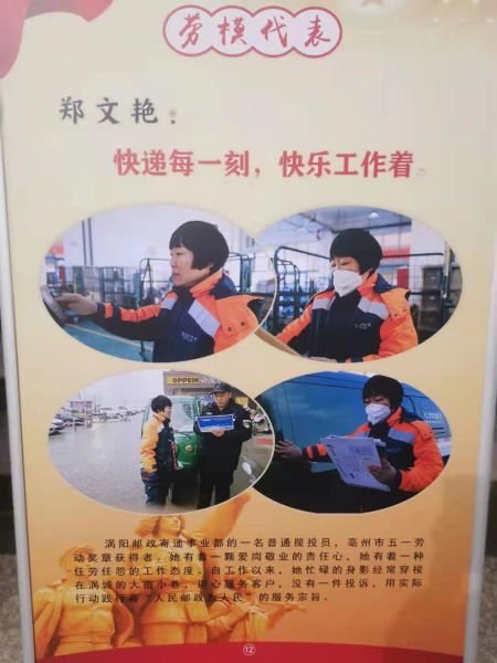 2021年4月16日,由渦陽縣縣委宣傳部主辦,縣總工會承辦的慶祝建黨100周年·最美勞動者風采圖片展正式啟動,作為奮斗在郵政戰(zhàn)線上的杰出代表,來自渦陽縣郵政分公司的快遞員鄭文艷,被選錄其中。