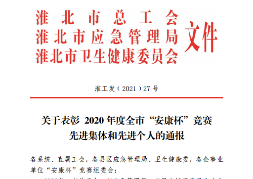 近日,淮北市總工會(huì)、淮北市應(yīng)急管理局、淮北市衛(wèi)生健康委共同下文表彰全市“安康杯”競(jìng)賽先進(jìn)集體和先進(jìn)個(gè)人,淮北郵政榮獲2020年度淮北市“安康杯”競(jìng)賽優(yōu)勝單位稱(chēng)號(hào)。