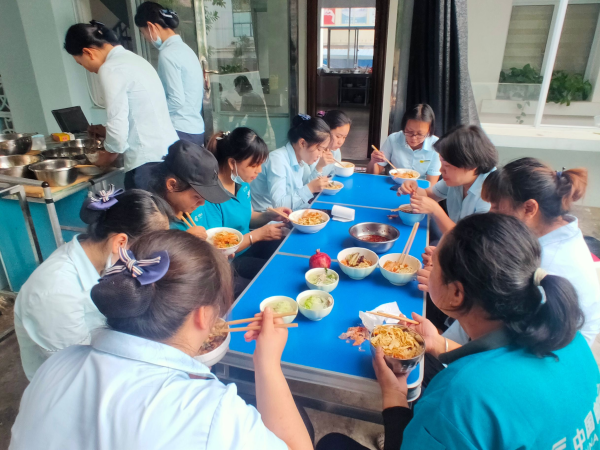 網(wǎng)點(diǎn)每天在“小食堂”用餐的員工已達(dá)12人,她們自發(fā)成立了食堂工作團(tuán)隊(duì),各自分工負(fù)責(zé)買菜、洗菜、切菜、炒菜、洗碗等,大家開玩笑的說:“食堂不大,工種卻很齊”。在“小食堂”用餐的員工還帶來了自家腌制的咸菜、臘肉等給大家分享品嘗,吃飯時(shí)一起談心交流,有說有笑,輕松歡快的氛圍讓她們看起來就是“一家人”。