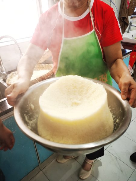 午飯過后,炊事員阿姨便將事先蒸好的熱騰騰的糯米端上了桌,大家洗蘆稿、準備盆,你一下我一下,一會功夫,香甜軟糯的糍粑就在歡聲笑語中制作了出來。