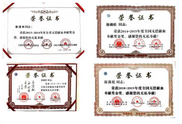 2010年,徐滿松接到了血站工作人員打來的電話,上饒市血站的血小板出現(xiàn)暫時(shí)短缺的現(xiàn)象,急需O型血小板。他二話不說,來到血站獻(xiàn)了兩個(gè)治療量的血小板(國(guó)家規(guī)定機(jī)采血小板捐獻(xiàn)間隔為兩周)。為了幫助更多需要用血的病人,徐滿松做了一個(gè)決定,以后要盡己所能參加無償獻(xiàn)血,由一開始的隨機(jī)獻(xiàn)血到每半個(gè)月自主到到血站獻(xiàn)血小板。自此,他成為了固定的無償獻(xiàn)血者,這一堅(jiān)持就是21年。一本本鮮紅的《無償獻(xiàn)血證》放在一起,裝滿了抽屜,像一座座光榮的豐碑。每當(dāng)手機(jī)上收到“你捐獻(xiàn)的血小板檢測(cè)結(jié)果合格,已經(jīng)用于臨床”的短信,徐滿松心里都會(huì)有一種莫名的激動(dòng)與喜悅。