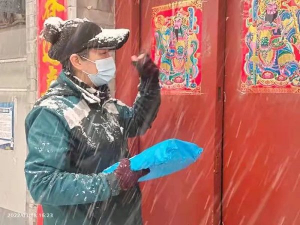 2022年3月18日,京城大雪紛飛。東四郵局投遞員楚維英冒著大雪為用戶投遞包裹。雪下得很密,雪花很大,道路很滑,大雪迷住了雙眼??床磺宄靶械穆?,為了能夠讓用戶早點(diǎn)兒收到包裹。她推著電動(dòng)車快步小跑著向前行進(jìn)。
