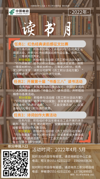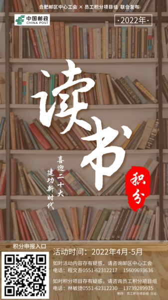 為熱烈慶祝黨的二十大到來(lái),傳承黨的光榮傳統(tǒng)和優(yōu)良作風(fēng),深入學(xué)習(xí)貫徹習(xí)近平新時(shí)代中國(guó)特色社會(huì)主義思想和黨的二十大精神,在第二十七個(gè)世界讀書(shū)日來(lái)臨之際,合肥郵區(qū)中心局工會(huì)與中心職工積分項(xiàng)目組聯(lián)合開(kāi)展“喜迎黨的二十大 共享紅色經(jīng)典閱讀”讀書(shū)月積分活動(dòng)。