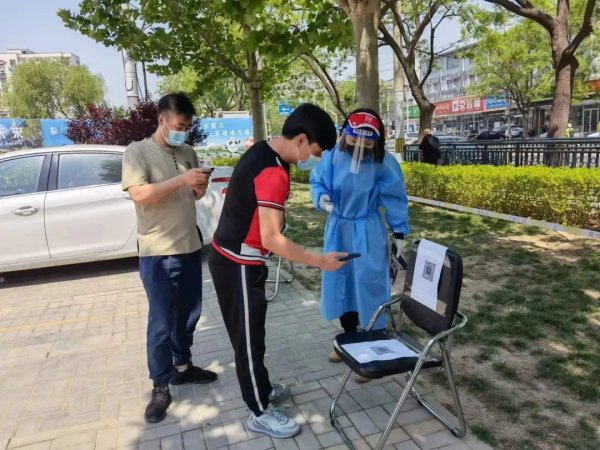 “請您掃碼后,間隔兩米排隊等候,今天核酸檢測的居民很多,請您耐心等候。”從早7:00到午飯前李博一直不斷重復(fù)著這句話,而妻子在一旁引導(dǎo)著居民掃碼和排隊,兩人配合默契,臨近16:00兩人看著逐漸變短的隊伍才漸感疲憊。