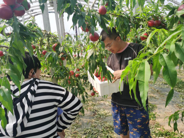 踏入桃園,紅彤彤的的油桃把樹(shù)枝壓彎了腰,像一盞盞紅燈籠高掛枝頭,在綠葉的映襯下更顯誘人。若是摘下來(lái)咬上一口,酥脆甘甜,滿嘴獨(dú)屬初夏的甜蜜味道。參與采摘的職工紛紛提籃采摘,三五成行,有說(shuō)有笑,他們小心翼翼地將桃子從樹(shù)上摘下來(lái),輕輕放回籃中,不時(shí)有人駐足拍照,好不熱鬧。
