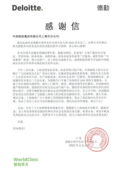 在六月復工復產(chǎn)之際,為了表達疫情期間豫園營業(yè)部的大力支持與幫助,德勤公司專程寫了一封感謝信,深切表達了感謝之情,感人至深。并表示希望雙方加大合作力度。(上海郵政工會)
