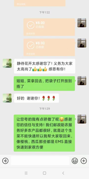 “這水果和菜真新鮮,可比旁邊小店里的看著好,你是從哪里買到的?”何軍的“郵政團(tuán)長(zhǎng)”正是從這一句開始的。一開始,何軍以嘗試的心態(tài)在郵樂(lè)優(yōu)鮮訂購(gòu)了幾次蔬菜和水果,而就在在小區(qū)門口拆包裝驗(yàn)貨時(shí),有鄰居路過(guò)看到菜品質(zhì)量非常好,上前詢問(wèn)購(gòu)買渠道,就從這一聲聲詢問(wèn)開始,何軍耐心細(xì)致地介紹郵政保供服務(wù),對(duì)鄰居們提出的訂購(gòu)問(wèn)題進(jìn)行逐一解答,并介紹了蔬菜禮包、西瓜等產(chǎn)品發(fā)貨快、新鮮的特點(diǎn)。在他的介紹和推薦下,鄰居們紛紛嘗試下單,并在體驗(yàn)后對(duì)郵政服務(wù)和郵政蔬菜的品質(zhì)贊不絕口。很快何軍和郵樂(lè)優(yōu)鮮便在小區(qū)居民中“火爆”了,周邊更多的小區(qū)居民也開始參與到線上訂購(gòu)的隊(duì)伍里。為了更好地服務(wù)鄰居們訂購(gòu)蔬菜,何軍更建立起了“郵政團(tuán)購(gòu)”服務(wù)群,及時(shí)關(guān)注每一位居民訂購(gòu)的情況,發(fā)現(xiàn)問(wèn)題第一時(shí)間解決,以優(yōu)質(zhì)的服務(wù)感動(dòng)了小區(qū)的居民。