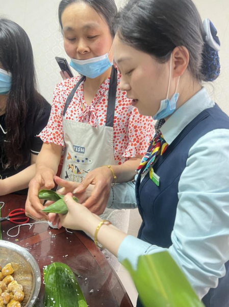 活動之前,工會精心準備,泡好粽葉、糯米等需要的食材?;顒又?,工會邀請了縣分公司小家食堂的“大廚”現(xiàn)場教學,為大家講解了不同包粽子的方法,大家邊看邊學,逐漸從生疏到熟練,不一會兒,桌子上便擺滿了形態(tài)各異的粽子。現(xiàn)場大家相互學習,相幫相助,氣氛熱鬧、溫馨又和諧。