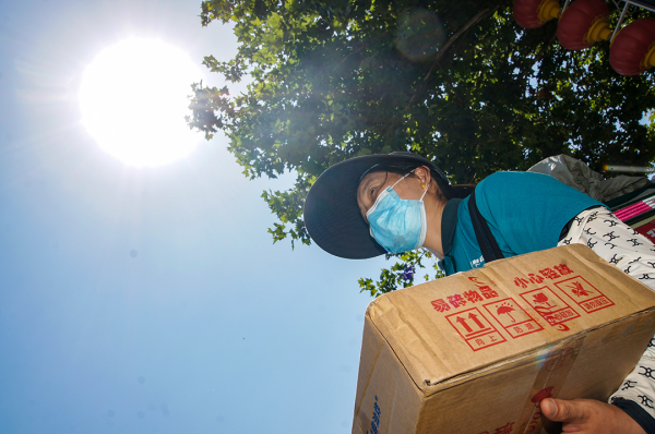在鄭州40℃多的高溫中,攬投員們常常一身汗水,還沒(méi)來(lái)得及擦,就被太陽(yáng)下襲來(lái)的熱浪蒸發(fā)得一干二凈,但攬投員并沒(méi)有因?yàn)檠谉岬奶鞖馔O履_步,而是毅然忙碌在投遞崗位上。