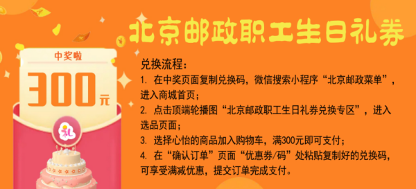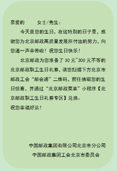 活動(dòng)時(shí)間為2023年4月1日至2024年3月31日。2023年北京郵政職工生日祝?;顒?dòng)由三個(gè)環(huán)節(jié)組成: 一是手機(jī)短信送祝福,在北京郵政職工生日當(dāng)天,商函中心將根據(jù)職工的有關(guān)信息,通過發(fā)送手機(jī)短信的方式送出祝福信及生日賀卡,并提示職工掃描賀卡中“郵會(huì)通”二維碼進(jìn)入“郵會(huì)通”微信公眾號(hào)。二是“郵會(huì)通”公眾號(hào)送驚喜,職工進(jìn)入“郵會(huì)通”微信公眾號(hào)后,打開“我愛我家”中的“生日祝福”專區(qū),進(jìn)入到“生日大抽獎(jiǎng)”界面,點(diǎn)擊“抽獎(jiǎng)”,將有機(jī)會(huì)抽取到30元-300元五個(gè)獎(jiǎng)項(xiàng)的生日禮券,同時(shí)還會(huì)得到相對(duì)應(yīng)的禮券兌換碼。 三是“北京郵政菜單”送福利,職工在中獎(jiǎng)頁(yè)面復(fù)制兌換碼,微信搜索小程序“北京郵政菜單”,進(jìn)入商城首頁(yè),然后進(jìn)行果疏生鮮、肉蛋副食、米面糧油、包裝食品、家居日化及飲料乳品等物品兌換。