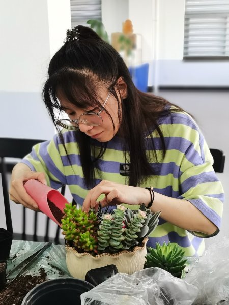 活動伊始,老師通過互動的方式,講解了多肉植物的歷史,喜好的環(huán)境、栽培和繁殖方法等,包括澆水、日照、病蟲害防止等生活中常見的問題,在DIY環(huán)節(jié),大家躍躍欲試,紛紛手持小工具饒有趣味地種植起來,一邊歡聲笑語,一邊請教老師意見,一會兒功夫,填土、配色、種植……一盆一盆有模有樣的多肉盆栽完工。