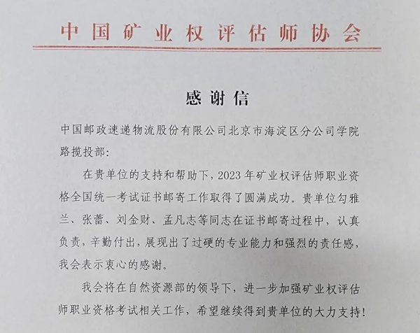新年伊始,學(xué)院路攬投部全體人員以良好的精神狀態(tài)和飽滿的熱情投入各項(xiàng)工作。與之對應(yīng)的,用戶用感謝信和錦旗給他們的工作打出一百分?!爸x謝你們的付出,證書寄遞工作已圓滿收官,為郵政的服務(wù)點(diǎn)贊!”1月10日,中國礦業(yè)權(quán)評估師協(xié)會的崔老師專程來到學(xué)院路攬投部送上感謝信,并表示,由于寄遞的物品比較特殊,學(xué)院路攬投部提供了郵件查詢的延伸服務(wù),寄遞中出現(xiàn)的問題也都得到妥善處理,為2023年礦業(yè)權(quán)評估師職業(yè)資格全國統(tǒng)一考試工作取得圓滿成功提供了有力保障。