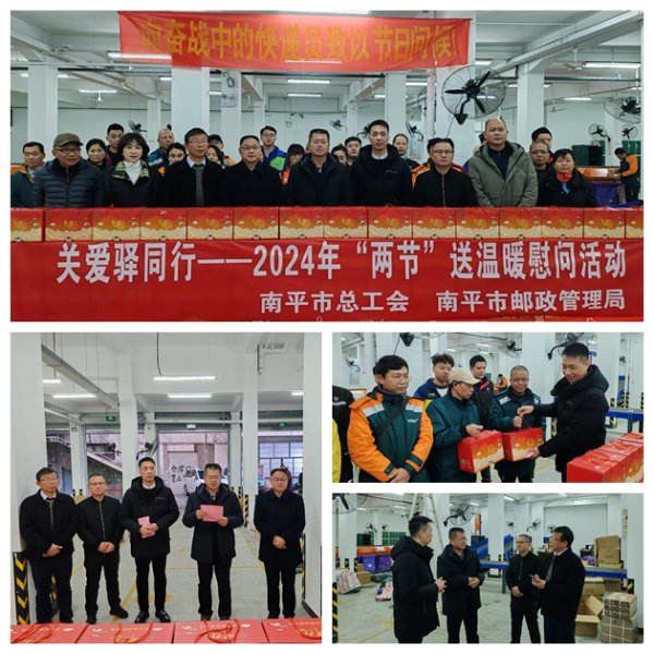 在春節(jié)來(lái)臨之際,1月30日下午,南平市總工會(huì)黨組成員、常務(wù)副主席朱金生帶領(lǐng)慰問(wèn)組一行,在南平市郵管局局長(zhǎng)牛振國(guó)、南平市分公司總經(jīng)理吳志斌的陪同下,來(lái)到延平郵政寄遞城北營(yíng)業(yè)部郵愛驛站,開展以“關(guān)愛驛同行—2024年兩節(jié)慰問(wèn)”為主題的新春慰問(wèn)新就業(yè)形態(tài)勞動(dòng)者活動(dòng)。來(lái)自郵政、順豐、京東、眾配等快遞小哥代表40余名參加。