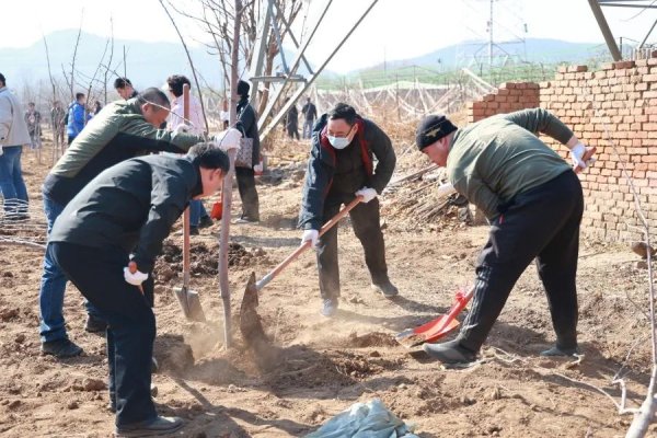 揮鍬鏟土、扶樹培土、圍堰澆水…… 植樹現(xiàn)場,大家3人一組默契配合,共同完成搬運、扶種、填土等環(huán)節(jié),保質(zhì)保量地完成了預(yù)期植樹目標。經(jīng)過一番熱火朝天的勞動,一棵棵蘋果樹苗迎風(fēng)佇立,為大地增添綠意生機。