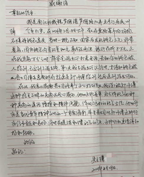 2月18日下午,惠南支局投遞員鄔正良像往常一樣出班投遞。3點半左右他來到黃路菜市場附近,在地上撿拾到一個錢包,打開發(fā)現(xiàn)里面有現(xiàn)金、銀行存折,還有兩張身份證,仔細一看,身份證屬于八九十歲的老人。想到失主必定心急如焚,鄔正良第一時間撥打了110,主動匯報了撿拾錢包情況,并在送完郵件后將錢包送至當?shù)嘏沙鏊J潞?,得到失主家屬電話稱贊。鄔正良說,自己的舉動并不特殊,相信很多人都會這么做,質(zhì)樸的話語讓人心生敬意。