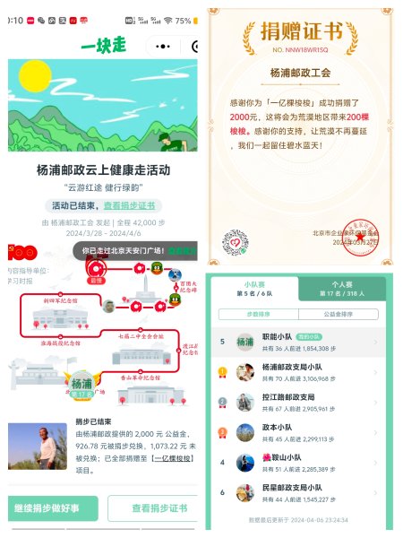 本次活動(dòng)于4月28日開始,為期10天面向楊浦郵政全體員工?;顒?dòng)內(nèi)容豐富多樣,既有云上紅色線路打卡的文化熏陶,又有步數(shù)兌換梭梭樹苗的公益實(shí)踐,還有累計(jì)步數(shù)排名獎(jiǎng)勵(lì)的激勵(lì)措施,吸引了廣大員工的積極參與。