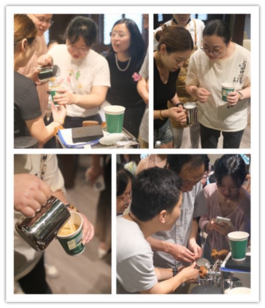 6月21日,在首場(chǎng)拉花體驗(yàn)課活動(dòng)中,咖啡師現(xiàn)場(chǎng)聲情并茂地講解并演示了奶泡制作和拉花技巧,大家聽(tīng)后,躍躍欲試,迫不及待地嘗試起來(lái)。按照老師教授的方法,完成了咖啡餅壓制、打發(fā)奶泡、簡(jiǎn)易拉花等程序,不久一杯杯造型各異的咖啡拉花作品呈現(xiàn)杯中。