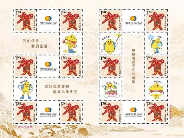 郵票的設計理念是本次方案的核心。此次個性化郵票的設計理念以明亞保險的歷程、成就和文化為核心,巧妙地將公司成立20周年的元素融入郵票設計中,既體現了公司的品牌形象,又凸顯了郵票的收藏價值。從設計稿的審查、印刷設備的校準,到印刷過程的質量監(jiān)控,每一步都執(zhí)行了嚴格的質量管控,確保每一枚郵票都能達到最高的品質標準。