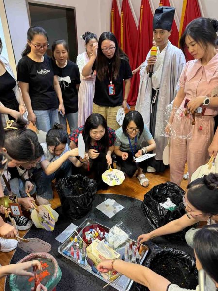 活動(dòng)伊始,指導(dǎo)老師首先向大家一一介紹了非遺漆扇的歷史淵源、文化底蘊(yùn)及制作工藝流程,并通過PPT視頻生動(dòng)演示了漆扇制作的全過程,并為下一實(shí)操環(huán)節(jié)提供了配色參考。