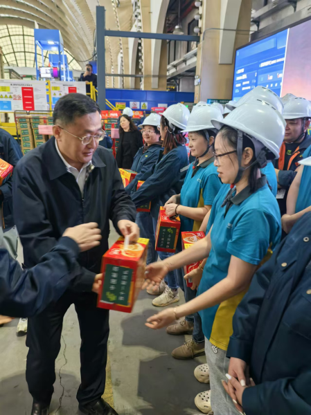 2024 年11月4日,正值雙十一旺季生產(chǎn)第二階段,市分公司黨委書(shū)記、總經(jīng)理李柏平率隊(duì)前往郵區(qū)中心王港處理場(chǎng)地,為奮戰(zhàn)在生產(chǎn)一線的員工送去溫暖與關(guān)懷。
