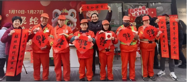 活動現(xiàn)場,特別邀約了三位杭郵書畫協(xié)會的資深書法大師,他們滿懷著熱情,鋪開了一張張充滿喜慶的紅色宣紙,蘸點濃墨、恣意揮毫,親身為現(xiàn)場的戶外工作者們書寫出一幅幅充滿著吉祥寓意、濃厚年味的對聯(lián)與“?!弊帧B涔P之處,遒勁有力,每一筆、每一劃都蘊含著我們郵政人對戶外勞動者們辛勤付出的認可與尊重。而我們的雙菱路“愛心驛家”站點也因此呈現(xiàn)出了一份從未有過的文化光景與藝術(shù)氛圍,現(xiàn)場的戶外工作者們臉上都洋溢著贊賞與感激,紛紛表示郵政的這項活動非常有意義,為他們的心靈上帶來了極大的鼓舞與溫暖。