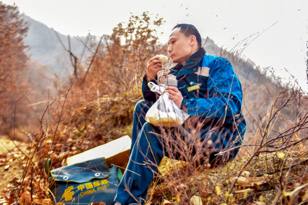 四棵樹鄉(xiāng)因五朵山而聞名,轄區(qū)最南的村莊和最北的村莊相隔50公里,山路崎嶇難行,張磊服務(wù)的25個村莊就散落在這茫茫大山中。車輛拋錨、山體滑坡、野狗偷襲……在這條郵路上,張磊遇到過各種困難,但他從未想過放棄。郵車無法通過的地方,他就背起近10公斤重的郵包徒步投遞,困了累了就靠在石頭上小憩。