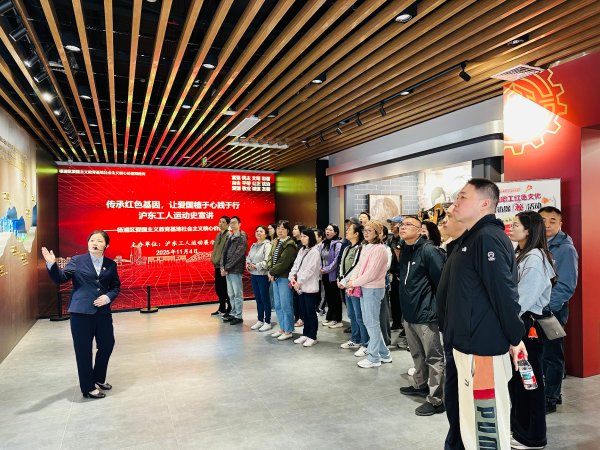 上午,在平?jīng)雎?500號(hào)滬東工人運(yùn)動(dòng)展示館,工會(huì)干部們沿著“歷史長(zhǎng)河墻”緩步前行,從1919年楊樹浦紗廠工人罷工的黑白照片,到1927年第三次武裝起義留下的“人壽里”石匾,再到五卅運(yùn)動(dòng)中滬東工人高舉橫幅的復(fù)原場(chǎng)景,一段段血與火的工運(yùn)史詩讓大家駐足凝視,紅色記憶變得可觸可感。面對(duì)“時(shí)代楷?!闭箙^(qū)充分激發(fā)了大家向“咱們工人有力量”的奮斗基因致敬,精神上再次補(bǔ)鈣。