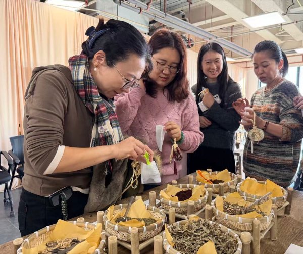 活動(dòng)伊始,在專業(yè)講解員的引導(dǎo)下,大家步入“登樓游園”古代生活器物展的雅致空間。一件件古樸典雅的家居器物與文房雅玩靜靜陳列,仿佛在訴說(shuō)舊時(shí)生活的從容與詩(shī)意。職工們駐足細(xì)觀,沉浸于傳統(tǒng)美學(xué)的意境之中,在器物與空間的對(duì)話里,感受跨越時(shí)空的生活智慧與人文韻味。隨后進(jìn)行的古法香囊手工制作環(huán)節(jié),將現(xiàn)場(chǎng)氛圍推向高潮。大家興致盎然,選取丁香、桂花、吳茱萸等天然香料,依個(gè)人喜好精心配比、細(xì)心填裝,在一捻一放之間,不僅體驗(yàn)著手作的專注與成就感,更在幽幽香氣中舒緩情緒、靜心寧神。不一會(huì)兒,一個(gè)個(gè)獨(dú)具個(gè)人風(fēng)格的解壓香囊陸續(xù)完成,成為每位職工專屬的“情緒調(diào)節(jié)小物”。