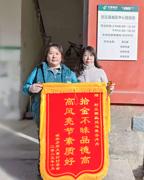 近日,河南省新鄉(xiāng)市封丘縣城關(guān)鄉(xiāng)后大章村的村民彭大娘和村委委員一起,來到了封丘縣郵政分公司城區(qū)中心攬投部,要當(dāng)面感謝攬投員岳丹丹。不巧的是岳丹丹正在段道上投遞,二人就將一面寫有“拾金不昧品德高,高風(fēng)亮節(jié)素質(zhì)好”的錦旗交給了攬投部內(nèi)務(wù)人員。彭大娘還再三叮囑說,一定要把錦旗交給岳丹丹。