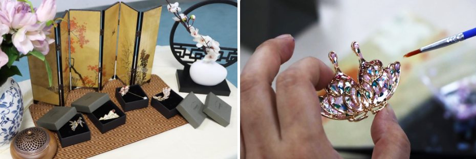 活動現(xiàn)場,非遺指導(dǎo)老師首先為大家細(xì)致講解螺鈿鑲嵌的歷史淵源與藝術(shù)特色。這項(xiàng)起源于商周時期的傳統(tǒng)裝飾技藝,以天然貝殼為原料,歷經(jīng)裁切、打磨、鑲嵌、拋光等多道精細(xì)工序,最終呈現(xiàn)出斑斕閃爍的視覺效果。在老師的分步示范與耐心指導(dǎo)下,員工們紛紛動手創(chuàng)作:從圖案設(shè)計、布局定位,到螺片切割、精準(zhǔn)拼接,再到貼合固定、局部拋光,每一個步驟都專注細(xì)致。原本樸素的胸針底托上,漸漸綴滿貝片拼合的花葉紋樣,指尖流轉(zhuǎn)間,一件件融入個人巧思、獨(dú)具風(fēng)格的螺鈿胸針悄然成型。