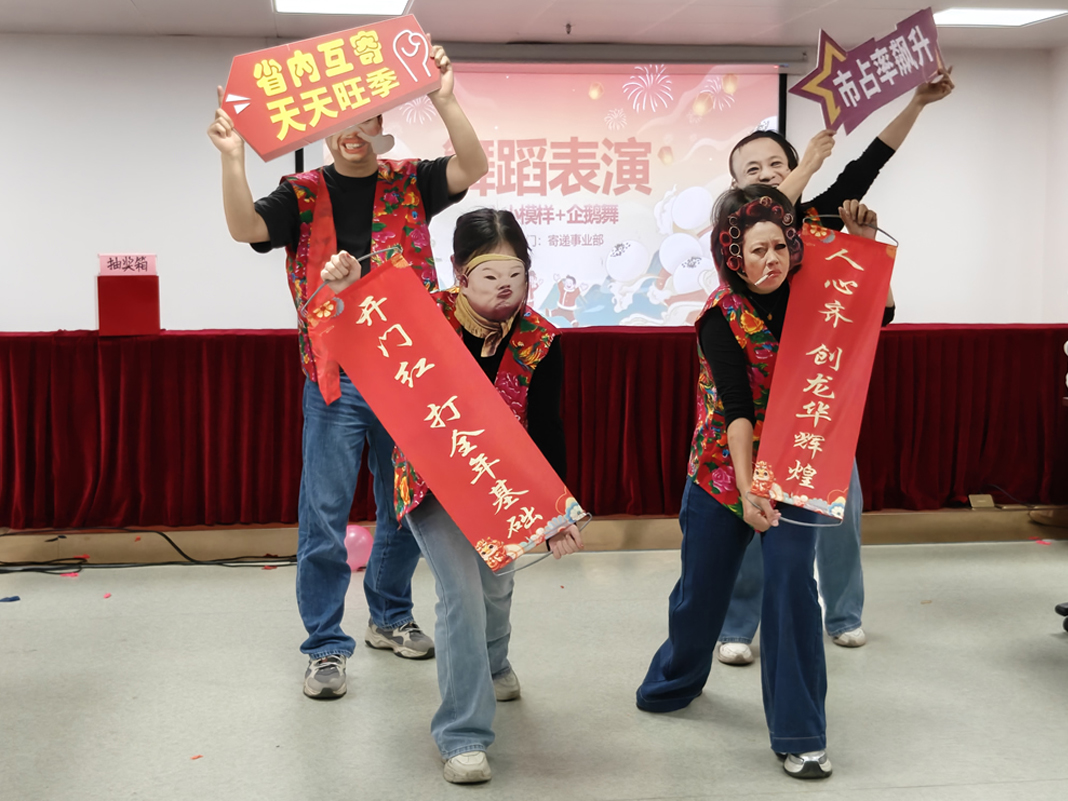 活動現(xiàn)場,全體員工歡聚一堂、暖意融融,氣氛熱烈非凡。趣味游戲環(huán)節(jié)精彩紛呈,猜燈謎、巧丟沙包、雙人協(xié)作、踩氣球等項目輪番登場。各項游戲中,看似簡單的規(guī)則,實則考驗著搭檔間的信任與配合,唯有互相補位、反應(yīng)迅速,才能脫穎而出。這些趣味競技不僅錘煉了員工的團(tuán)隊協(xié)作能力與反應(yīng)速度,更在歡聲笑語中拉近了彼此距離,進(jìn)一步增強了團(tuán)隊的凝聚力與向心力。游戲之余,寄遞團(tuán)隊的同事們獻(xiàn)上了精彩的《企鵝舞》表演,最后別出心裁的結(jié)束造型,寓意著龍華局“人心齊、勇爭先、創(chuàng)輝煌”的美好愿景,為活動增添了別樣驚喜。